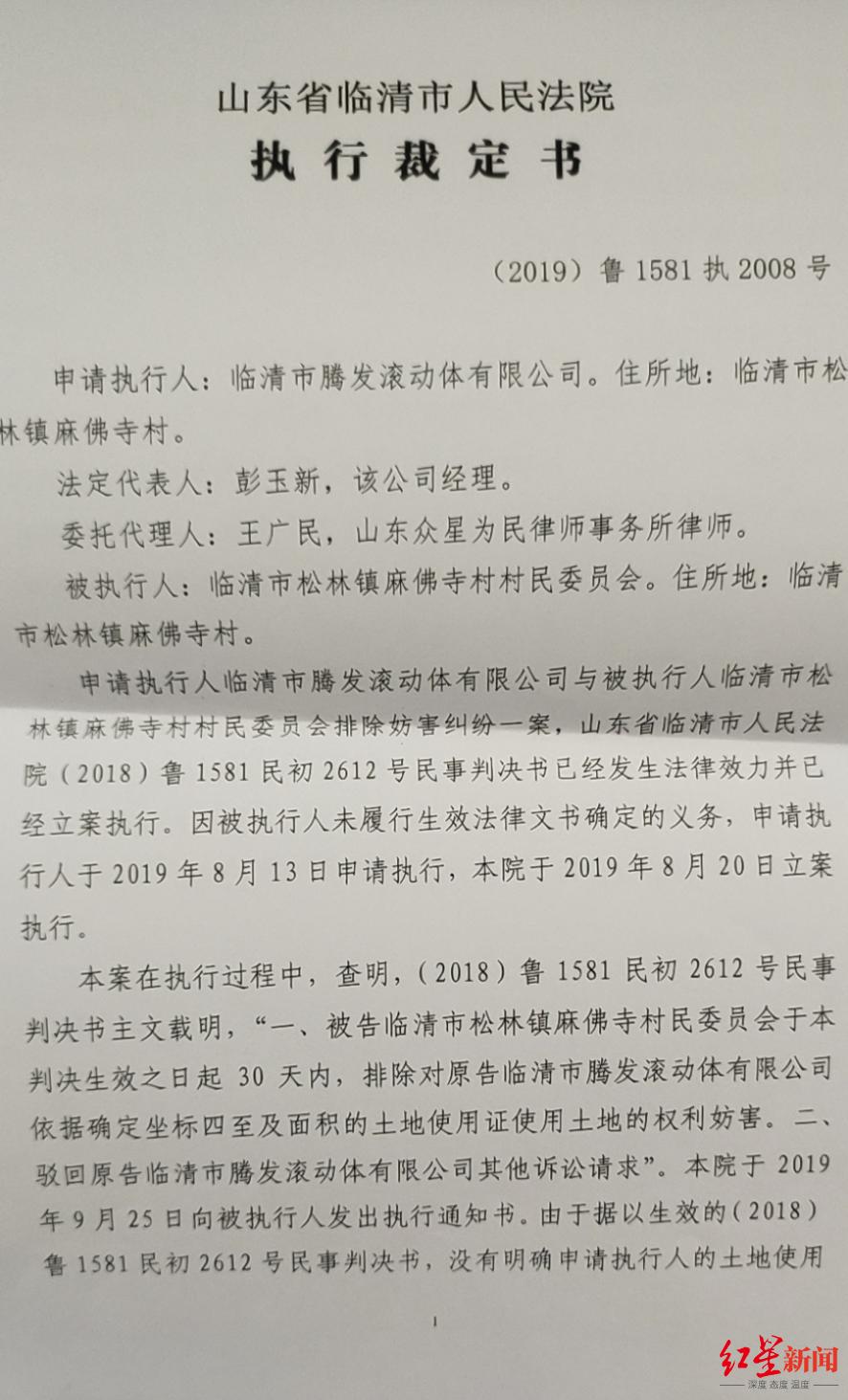 红星新闻记者注意到,临清市人民法院判决麻佛寺村委会排除妨害后,麻佛寺村委会并未执行,随后,腾发公司向法院申请执行。