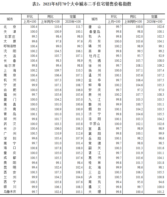 国家统计局城市司首席统计师绳国庆解读称,2021年8月份,各地全面落实房地产长效机制,持续加强房地产市场调控,70个大中城市商品住宅销售价格环比、同比涨幅总体延续回落态势。
