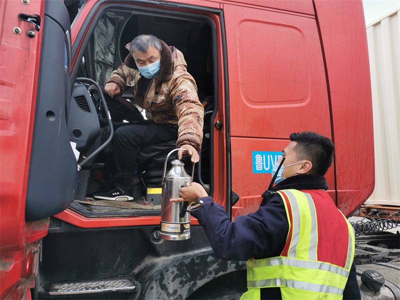 记者了解到,寒潮来袭,客运公司细心地为因停航无法出行的货车司机提供送热水服务,驱逐冬日严寒。