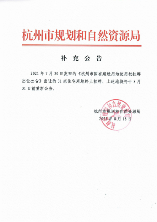 杭州市规划和自然资源局发布补充公告称,2021年7月30日发布的《杭州市国有建设用地使用权挂牌出让公告》出让的31宗住宅用地终止挂牌,上述地块将于8月31日前重新公告。这已是杭州第二次延期,此外,近期已有苏州、济南、长沙、深圳、天津、青岛、福州等多城市的第二次集中供地都相继被叫停或延期。