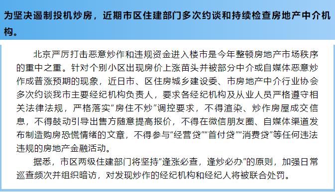 北京房地产中介行业协会今天发文:为坚决遏制投机炒房,近期市区住建部门多次约谈和持续检查房地产中介机构。