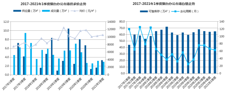 烟台商办市场1季度供销平稳,因商业产品新增较多,截止2021年3月底商办物业存量达到318万㎡,表现为供大于求;