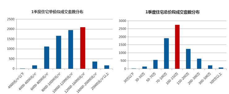 单价段成交——1季度住宅市场单价段12000-16000元/㎡为主力,成交2098套,占比28%,其次为10000-12000元/㎡产品,成交1949套,占比26%。