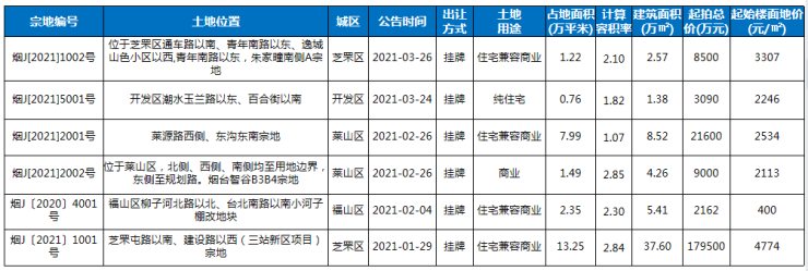 土地成交明细——1季度商住类土地成交7宗,其中2宗位于莱山区,2宗位于芝罘区,2宗位于高新区,1宗位于福山区。