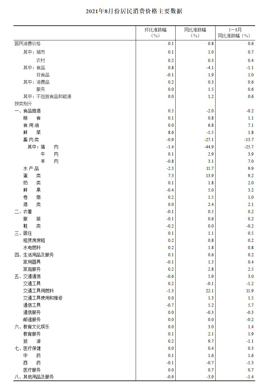 国家统计局:8月份CPI同比上涨0.8%,环比上涨0.1%