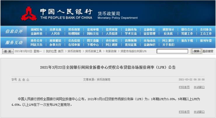 中国人民银行授权全国银行间同业拆借中心公布,2021年3月22日贷款市场报价利率(LPR)为:1年期LPR为3.85%,5年期以上LPR为4.65%。以上LPR在下一次发布LPR之前有效。