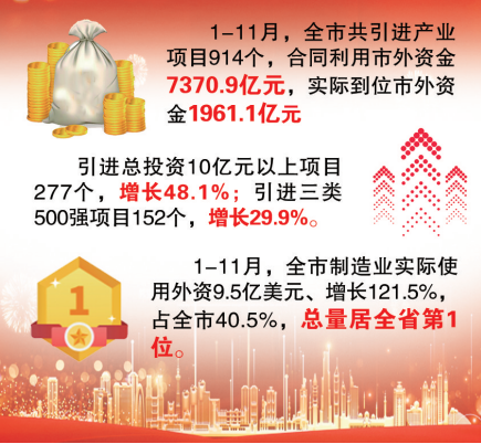 招商引资从未停步。今年以来,全市上下深入贯彻落实省委省政府“打头阵、当先锋、上层次”部署要求,锚定“1+233”工作体系,聚焦“12335”中心城区建设,凝心聚力推动招商引资,用心用力抓好产业培育。1-11月,全市共引进产业项目914个,合同利用市外资金7370.9亿元,实际到位市外资金1961.1亿元,其中,引进总投资10亿元以上项目277个,增长48.1%;引进三类500强项目152个,增长29.9%,其中世界500强项目48个、中国500强项目81个、民营500强项目23个。