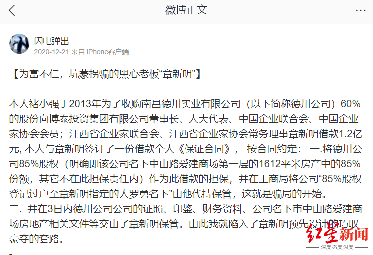 褚小强2020年12月21日在微博发文实名举报章新明,其中提到,2013年,自己曾因收购南昌德川实业有限公司(以下简称德川公司)60%的股份而向章新明借款1.2亿元,此后深陷该借贷纠纷中。