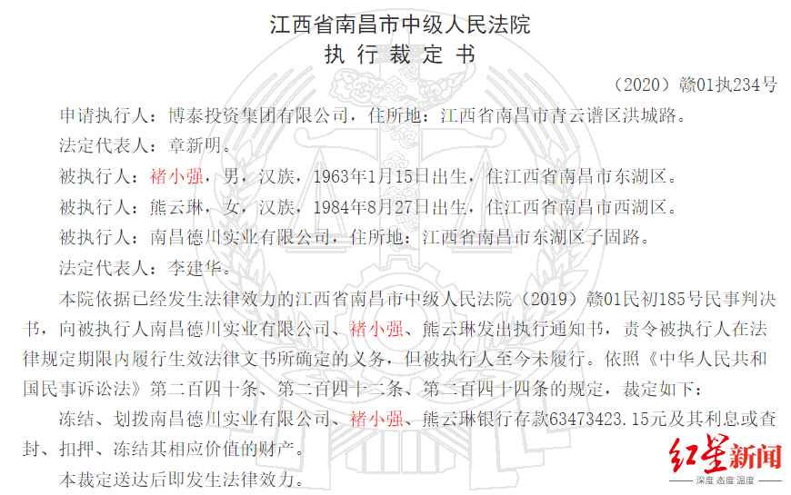 2017年7月,博泰投资集团起诉褚小强、熊云琳夫妻,要求偿还借款本息1.836亿元,德川公司承担连带责任。褚小强不服判决,上诉至江西省高级人民法院,被驳回维持原判。2019年11月,江西省南昌市中级人民法院一审判决,褚小强夫妻偿还欠款,被告未到庭参加诉讼。