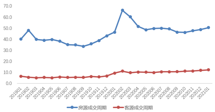 根据贝壳研究院数据,今年1月,18城房源成交周期为50.5天,环比延长1.9天,同比延长4.2天;客源成交周期为12.2天,环比延长0.5天,同比延长3.0天。房客源成交周期自去年2月后,持续保持高位水平,2020年重点18城房源成交周期平均50.8天,客源成交周期10.4天,相较去年成交周期均值,今年1月房源成交周期微缩0.3天,客源成交周期则小幅延长1.8天,租赁市场业主房屋出租难度不减。