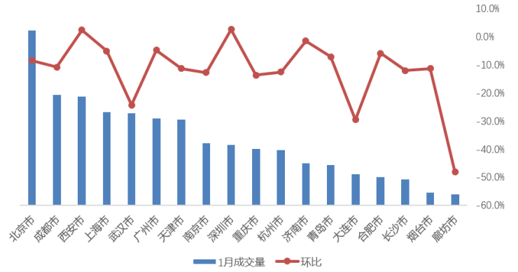 细分城市来看,今年1月,18城中,西安、深圳租赁成交量环比有小幅上涨,其余16城市均环比下降,其中成都、武汉、天津、南京、重庆、杭州、大连、长沙、烟台和廊坊10城租赁成交量环比降幅超10%。因受疫情影响,1月廊坊租赁成交量环比降幅近50%,大连市环比降幅近30%。