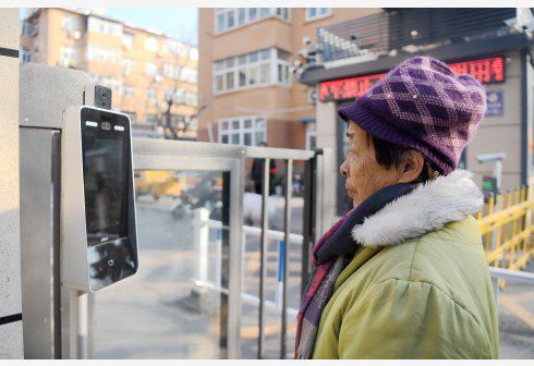 在邯郸市某小区,居民通过人脸识别设备经过小区的出入口(图片来源:新华社)
