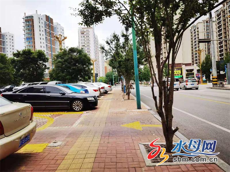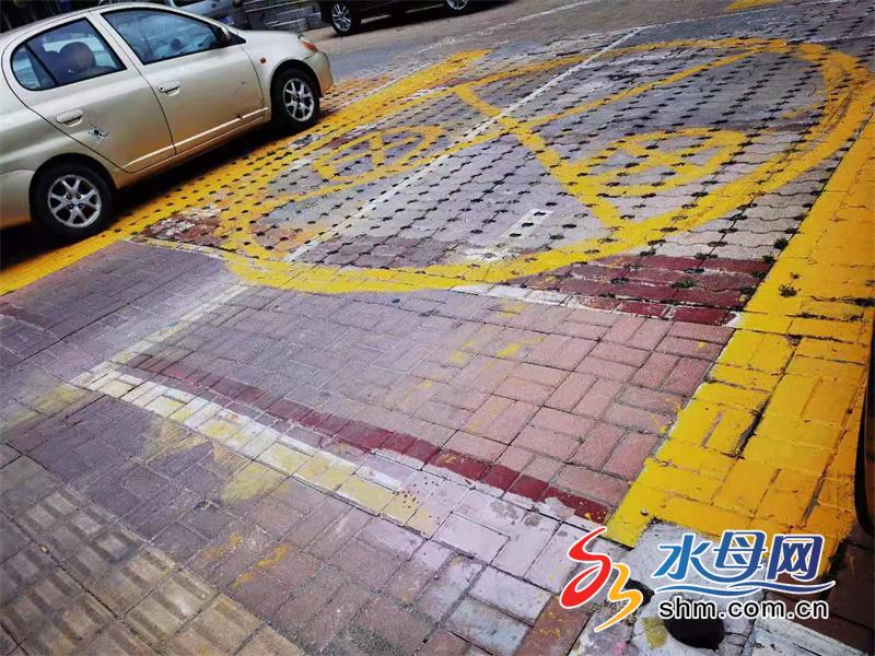 6月10日下午,记者来到福山区南苑街与福海路交叉口,看到东南侧的马路牙子的确有一段3米左右的“开口”,这一段的路沿石的高度比两侧的低了不少,基本与路面齐平。路沿石里侧的这段人行道,路面坑洼不平,与其东西两侧的路面极不协调,好像被人“动过了手脚”。人行道上被人用油漆喷涂了一个醒目的黄色箭头,从北向南指向里侧。再往里,地面上同样用黄色油漆划上了禁停的标志,正好占据了原来的两个停车位的位置。继续往里走,看到一个醒目的黄色箭头从西南方指向东北方。