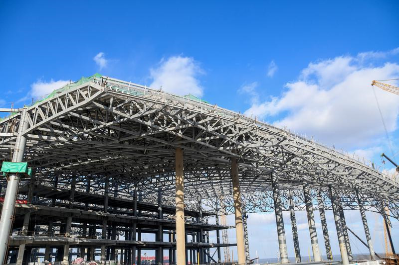 “在4个商务会展项目方面,八角湾国际会展中心目前地下室主体结构全部完成,地上二次结构完成70%。屋面压型板完成85%,屋面保温完成70%,屋面铝镁锰板完成55%。”八角湾国际会展中心总包项目经理马佳宽介绍说,集会展区、会议区和配套商业区为一体的烟台八角湾国际会展中心,总建筑面积达20.06万平方米,其中展厅面积约10.5万平方米,整体建成后将成为烟台较大的会展中心。