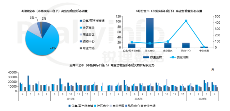 2021年4月份全市商业市场新增117套,约2.31万平,面积环比增加67%,同比增加12%;销售134套,约1.73万平,面积环比增加6%,同比增加11%;成交均价14370元/平,环比下跌14%,同比下跌1%。截止到4月底,全市商业市场存量170.4万平,存量继续累积,去化周期升至73个月。