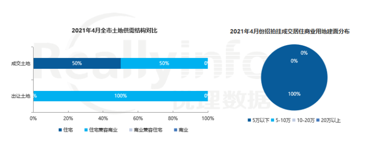 【土地结构】本月供应以住宅及住宅兼容商业用地为主,各占比50%;成交地块中5万平以下小地块占比100%。