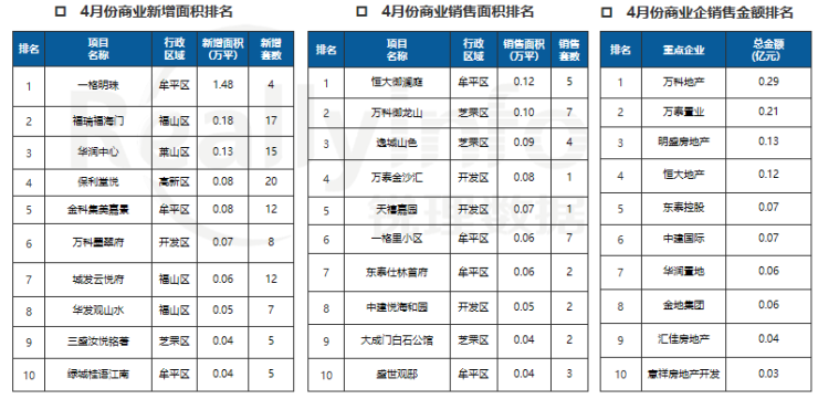 【商业排行榜】4月,一格明珠项目居新增面积榜排名前列,恒大御澜庭项目居销售面积榜首位,万科地产本月企业销售额榜首