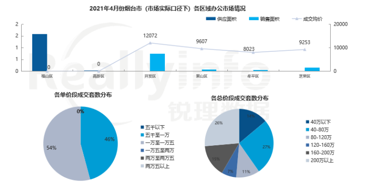 【区域对比】4月,办公市场新增供应主要来自福山区;开发区销售面积居首;1万-1.5万/㎡单价段和40-80万总价段占办公产品成交份额较大