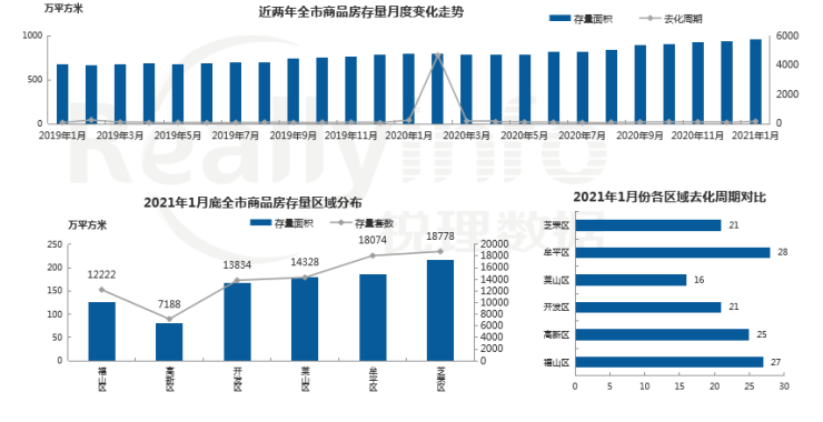 2021年1月份全市商业市场新增338套,约5.05万平,面积环比上升21%,同比上升835%;销售280套,约2.95万平,面积环比下降18%,同比上升40%;成交均价13819元/平,环比上升18%,同比下降14%。截止到1月底,全市商业市场存量170.4万平,存量继续累积,去化周期升至64个月。