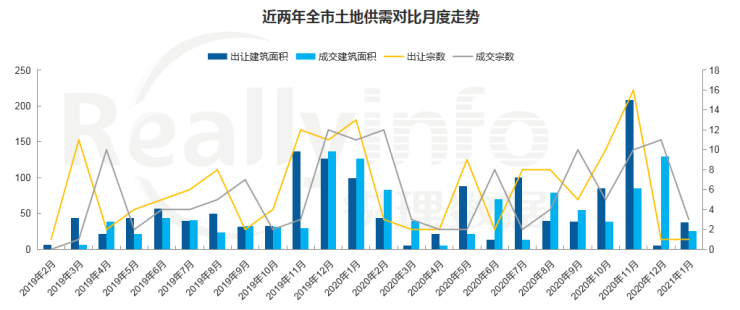 1月土地市场供应量上升,共出让土地1宗,建面约37.6万平,面积环比上涨603%、同比下降62%;1月土地市场成交量下降,共成交土地3宗,建面约25.26万平,面积环比下降80%、同比下降80%。