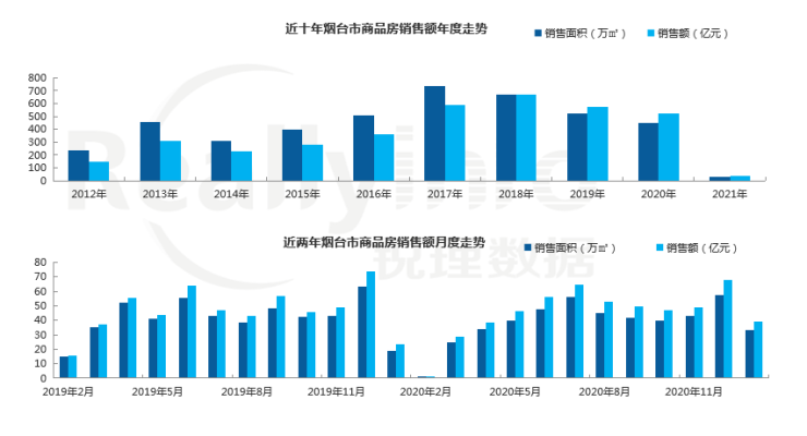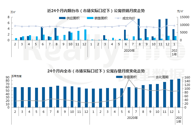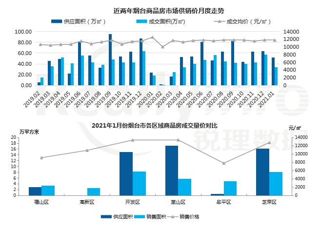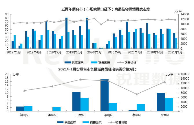 2021年1月份全市商品房市场新增4727套,约51.91万平,面积环比下降19%、同比增加119%;销售3040套,约33.29万平,面积环比下降42%、同比降低79%;成交均价11792元/平,与上月基本持平、同比下降6%。分区域看,开发、芝罘等区为供销热点区域。