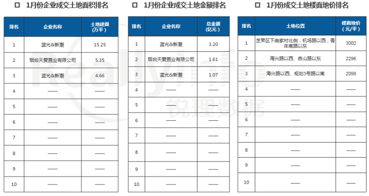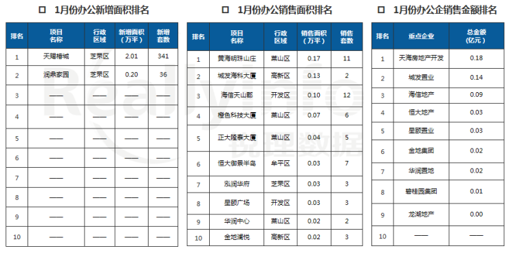 【办公排行榜】1月,天赐椿城项目居新增面积榜排名前列,黄海明珠山庄项目居销售面积榜首位,天海房地产开发获得企业销售额榜首
