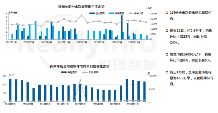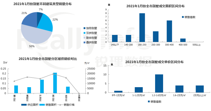 1月份全市别墅市场无新增供应。销售22套,约0.6万平,销售环比下降23%,同比下降24%;成交均价16696元/平,价格环比下跌6%,同比下跌5%。截止1月底,全市别墅市场存量为46.8万平,去化周期67个月。