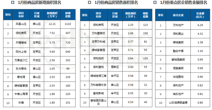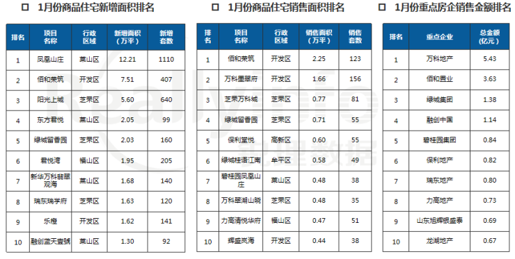 【商品住宅排行榜】1月份凤凰山庄新增面积榜首位,佰和荣筑居销售面积榜首位,万科地产居本月企业销售额榜首