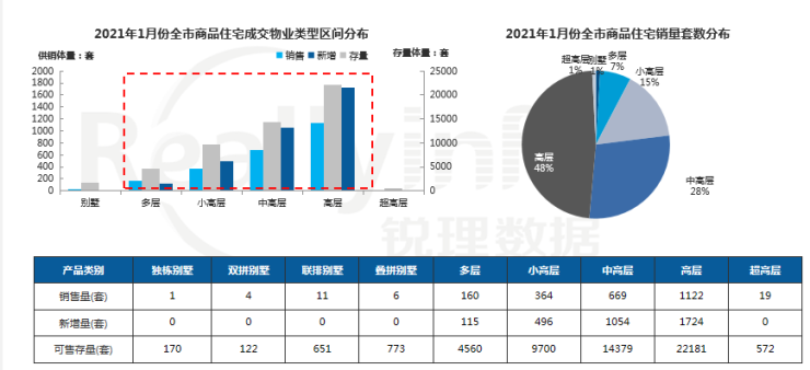 【建筑类型】1月份高层成交最多,占比48%,其次是中高层;超高层成交量最少