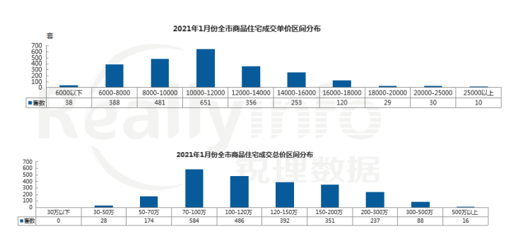 2021年1月份, 1-1.2万元/平之间单价段产品成交最多,占比28%,其次是0.8-1万元/平单价段,占比20%;从总价来看,70-100万总价段成交量较大,共计584套,占比25%,其次为100-120万总价段,占比21%。