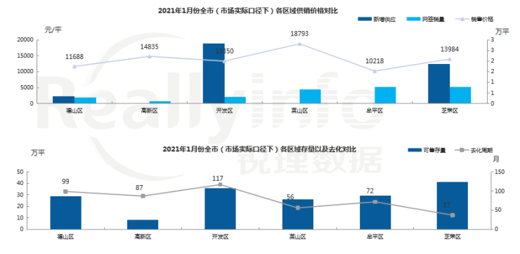 【存量去化】截至1月末全市商品房存量957.80万㎡,去化周期为22个月。各区域中,芝罘区库存较高,高新区存量较低。