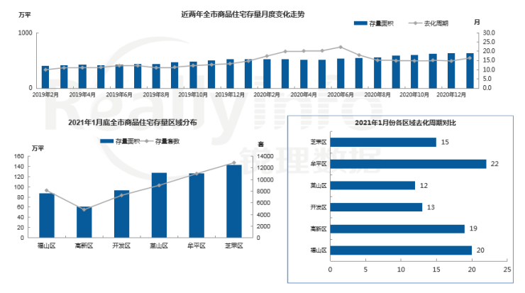 【存量去化】截至1月末商品住宅市场存量为635.7万平,去化周期16个月。各区域中,芝罘、莱山及牟平区库存最多,莱山区去化周期最短。
