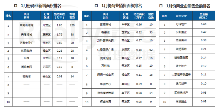 【商业排行榜】1月,中南山海湾项目居新增面积榜排名前列,富苑新城项目居销售面积榜首位,万科地产本月企业销售额榜首