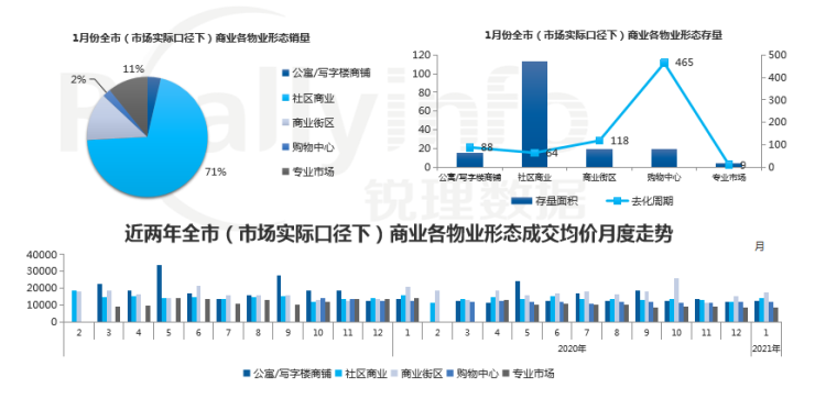 【物业形态】1月,商业市场中社区商业成交占比依旧较高,为市场需求主力;存量方面,社区商业存量较高,购物中心去化周期最长;价格方面,本月商业市场各物业商业价格均有小幅度上涨趋势。