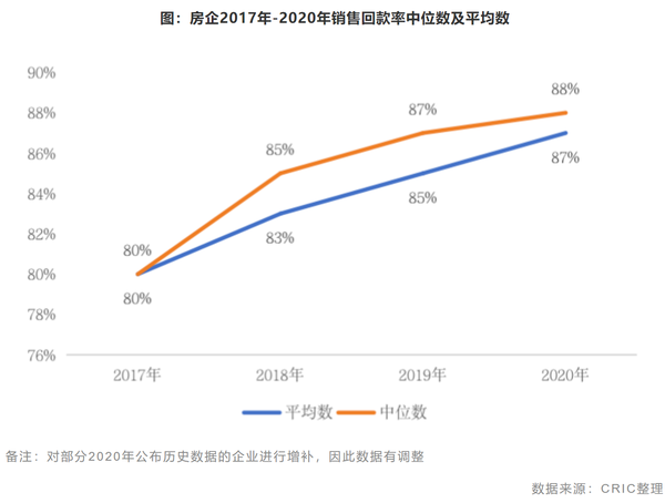 据CRIC统计,共有37家房企公布了其2020年的回款率数据,2020年房企销售回款率的中位数为88%,平均数为87%,可以发现不论是从哪一个数值来看,房企整体的销售回款情况都呈现一个稳步上升的趋势。