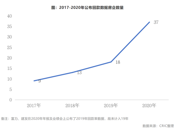 据CRIC统计,2017年时仅有包括恒大、远洋、世茂在内的9家房企公布了其全年业绩销售回款情况,数量较少。在此之后两年,公布回款数据的房企数量开始出现增长,截止至2020年年报季,公布销售回款率的房企数量已经达到了37家,超出2019年一倍还多。