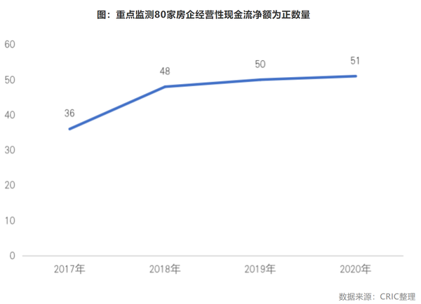 随着回款率的提高,房地产经营性现金流转正的情况也有所改善,以CRIC重点监测的80家房企数据为例,近年来房企经营性现金净额为正的企业数量从2017年的36家已经增长至2020年的51家,连续三年保持增长。