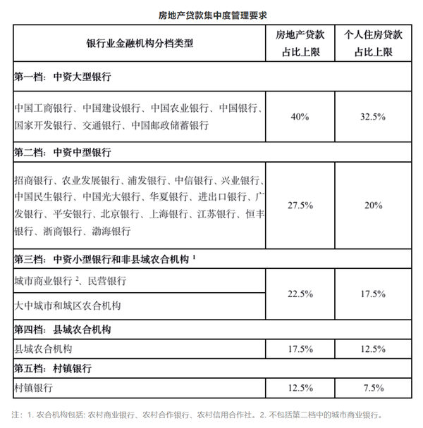 要求银行业金融机构(不含境外分行)的房地产贷款占比以及个人住房贷款占比要满足人民银行、银保监会确定的管理要求,其中,银行业金融机构按类型分档,其房地产贷款占比上限各档不高于40%、27.5%、22.5%、17.5%及12.5%;个人住房贷款占比上限各档不高于32.5%、20%、17.5%、12.5%、7.5%。