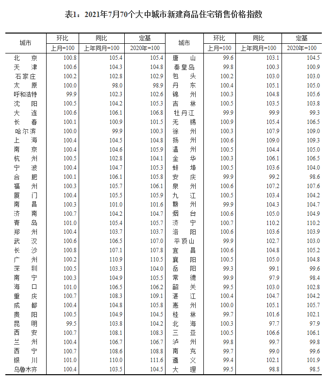 人民网北京8月16日电 (申佳平)今日,国家统计局发布2021年7月份70个大中城市商品住宅销售价格变动情况。国家统计局城市司首席统计师绳国庆表示,2021年7月份,70个大中城市商品住宅销售价格环比、同比涨幅总体回落。