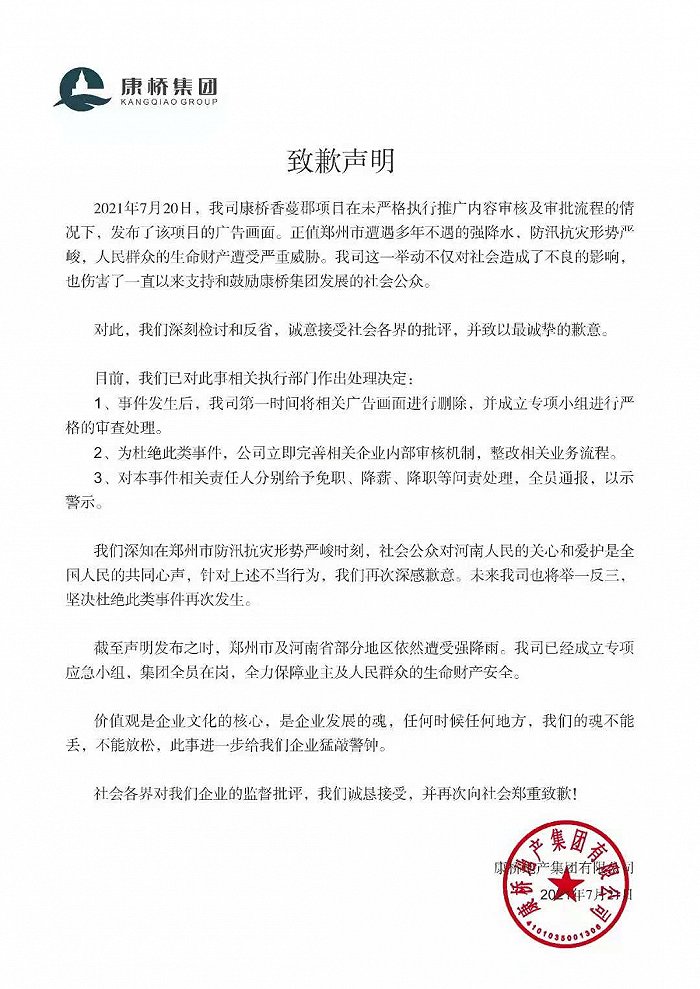 7月21日早间,康桥地产就公司项目在郑州强降雨宣传海报引发舆情,发布致歉声明。声明称,公司已排名前列时间撤下相关广告画面,并将严格审查处理。“将完善内部审核机制,整改相关业务流程。对相关责任人给予免职、降薪、降职等问责处理,并全员通报。”
