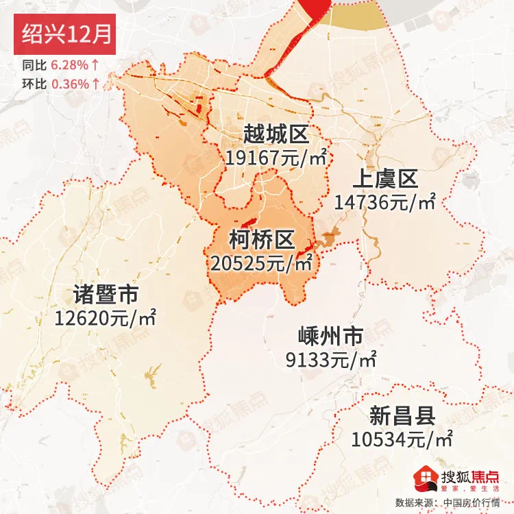 绍兴12月均价为13797元/㎡同比上涨6.28%↑,环比上涨0.36%↑