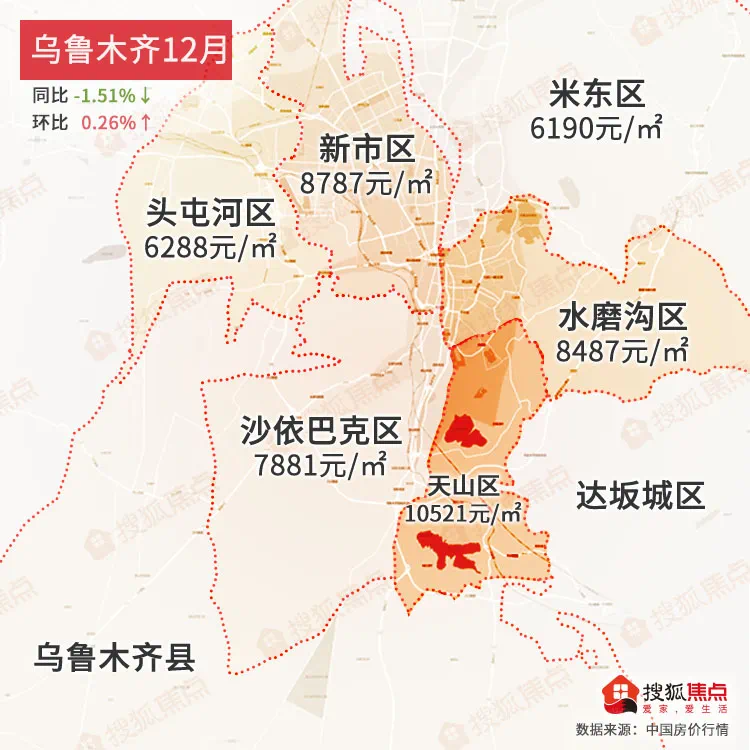 乌鲁木齐12月均价为8625元/㎡同比下跌-1.51%↓,环比上涨0.26%↑