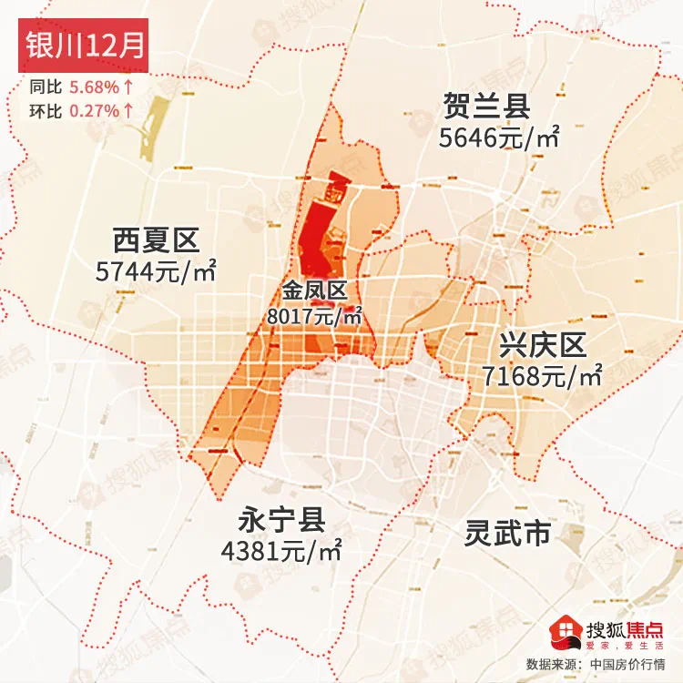 银川12月均价为7082元/㎡同比上涨5.68%↑,环比上涨0.27%↑