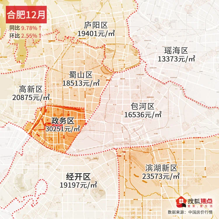 合肥12月均价为17574元/㎡同比上涨9.78%↑,环比上涨2.55%↑