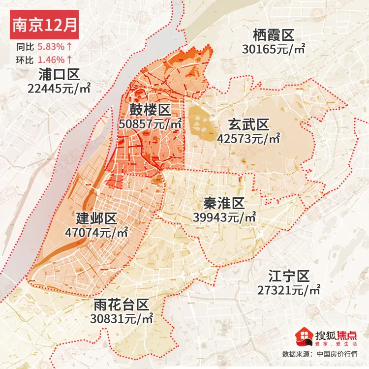南京12月均价为32855元/㎡同比上涨5.83%↑,环比上涨1.46%↑