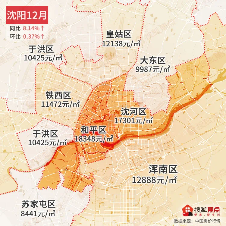 沈阳12月均价为12298元/㎡同比上涨8.14%↑,环比上涨0.37%↑