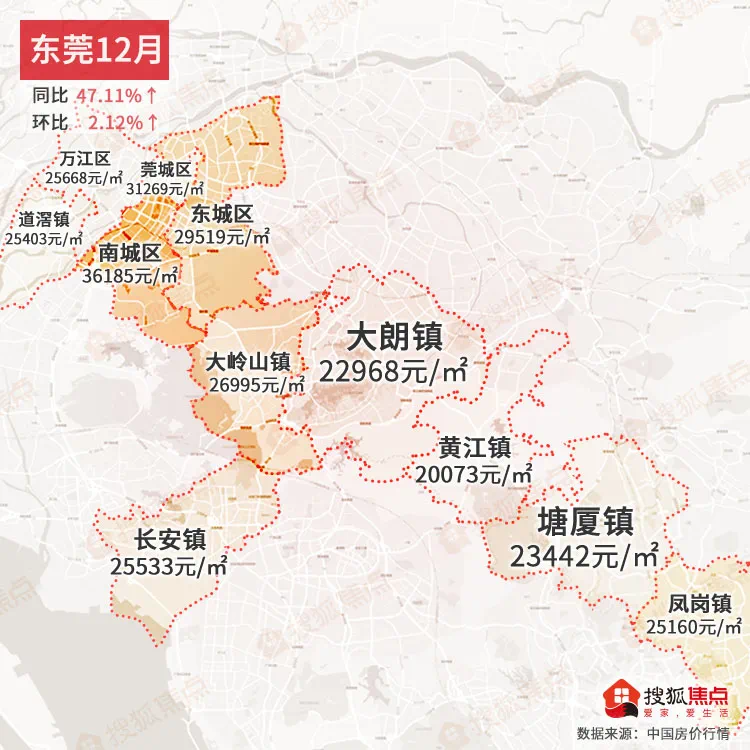 东莞12月均价为23375元/㎡同比上涨47.11%↑,环比上涨2.12%↑