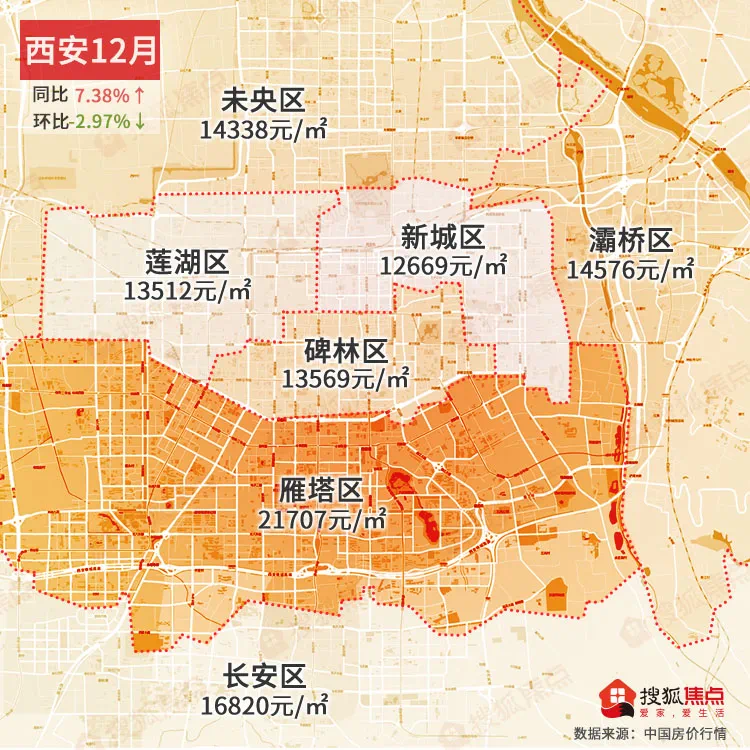 西安12月均价为15854元/㎡同比上涨7.38%↑,环比下跌-2.97%↓