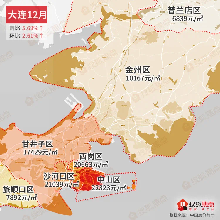 大连12月均价为16609元/㎡同比上涨5.69%↑,环比上涨2.61%↑
