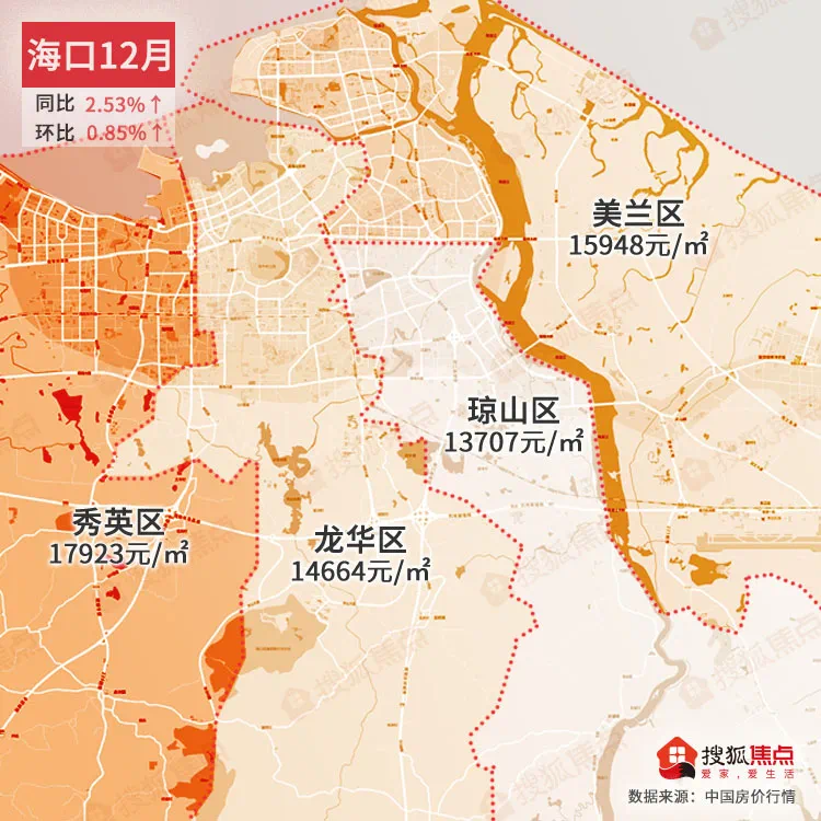 海口12月均价为15553元/㎡同比上涨2.53%↑,环比上涨0.85%↑